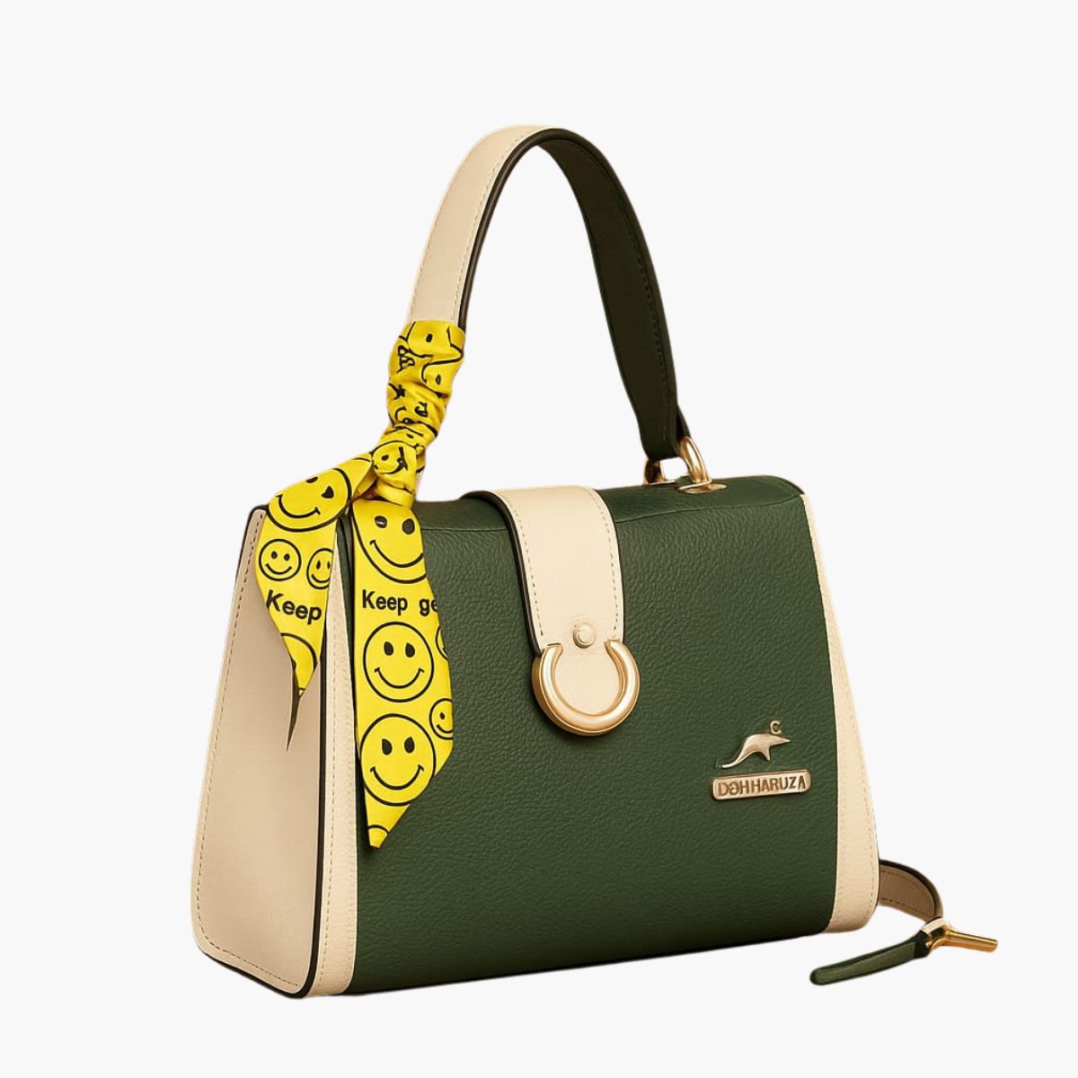 স্টাইলিশ ডিজাইনের গ্রীন-ক্রিম কালারের লেডিস হ্যান্ডব্যাগ।
